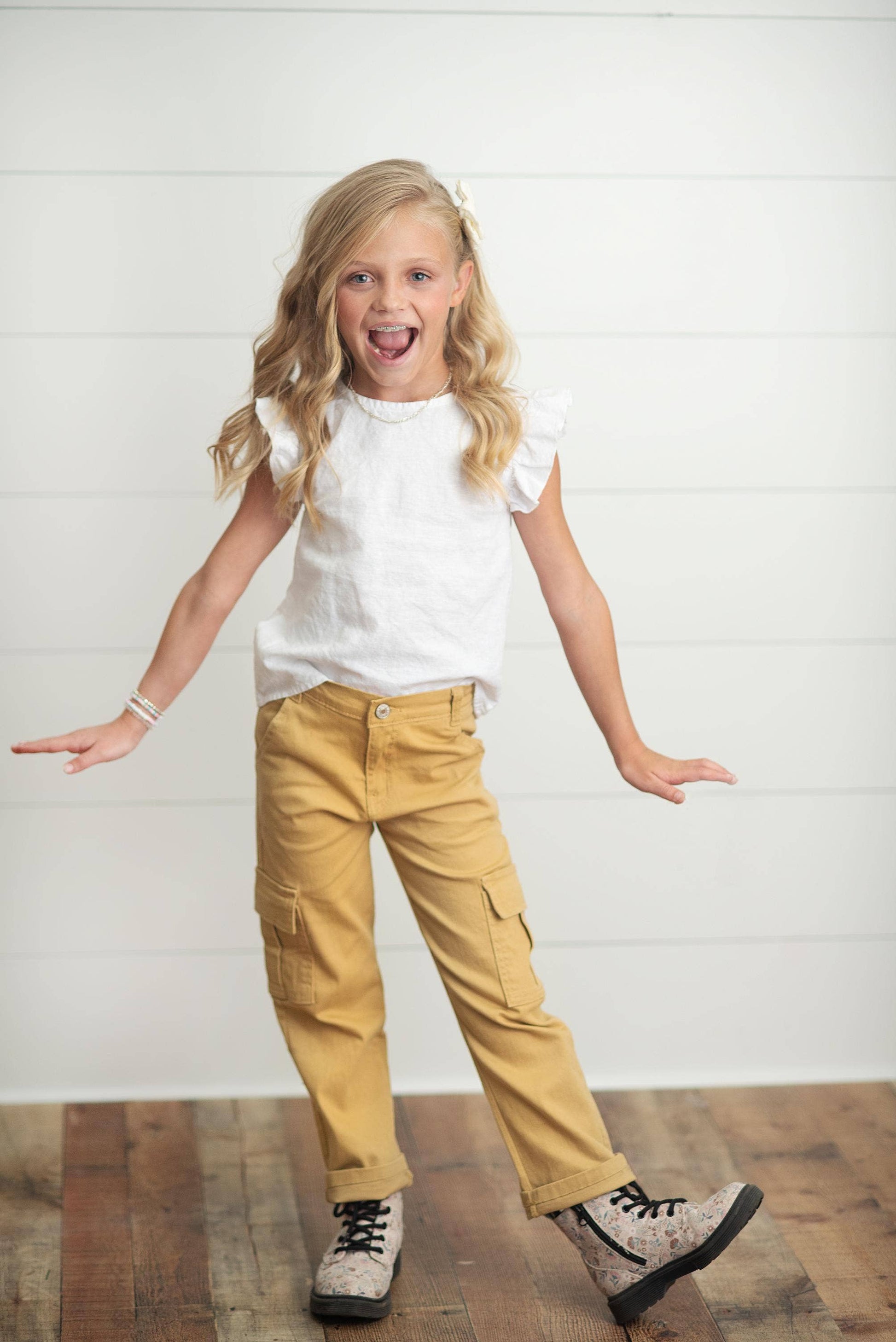 Adorable cargo pants in mustard yellow or olive green. Button and zipper front with tons of pockets. Cutest basic for any season or game days!